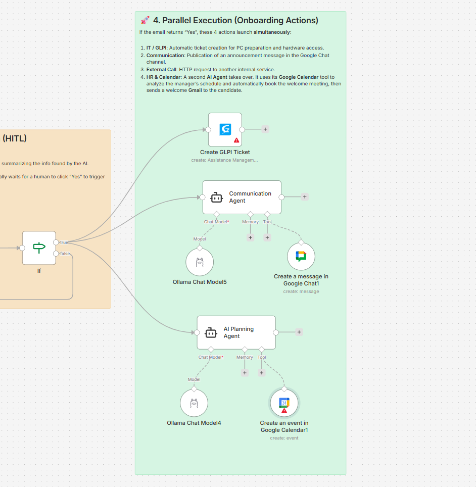 Once the approval decision is Yes, the workflow automatically triggers multiple onboarding actions simultaneously to ensure a smooth and fully automated employee onboarding process.